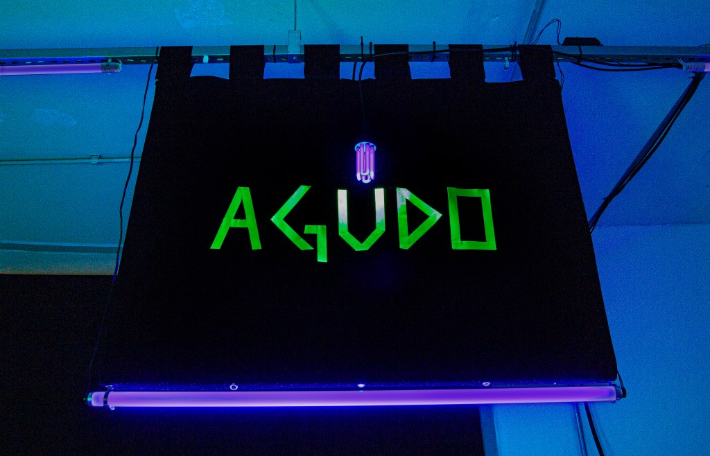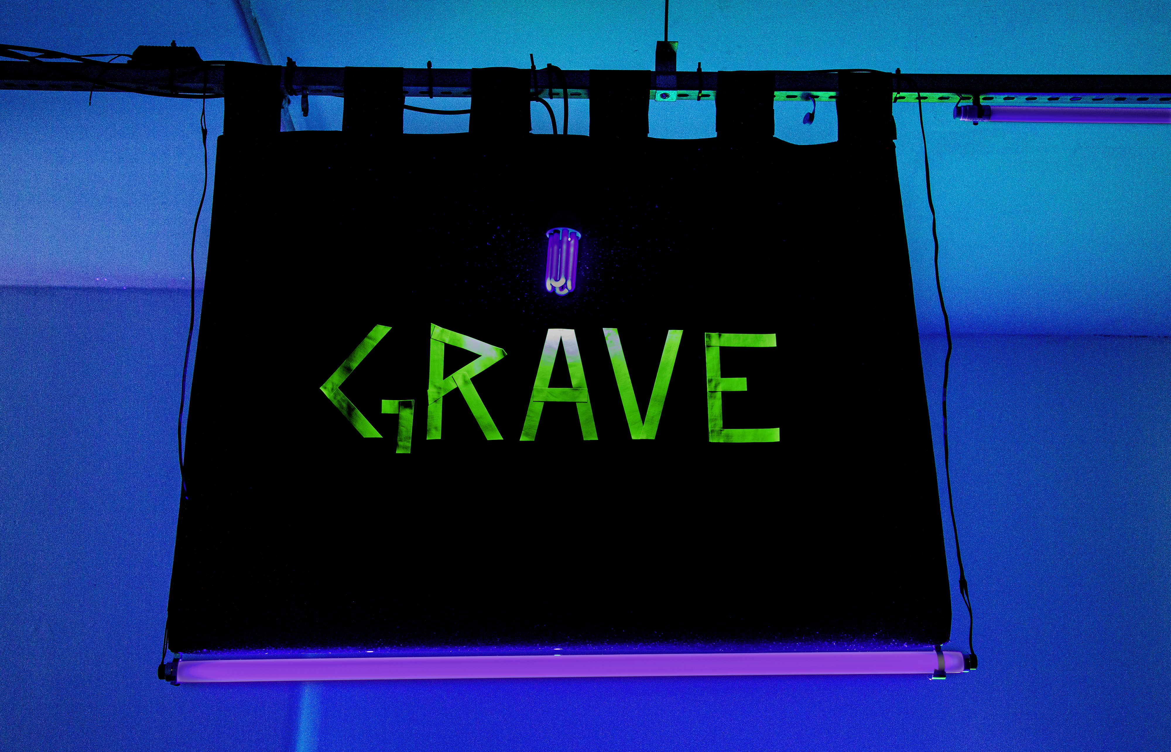 Grave/Agudo, veludo, fita fluorescente, luz negra, 2019
